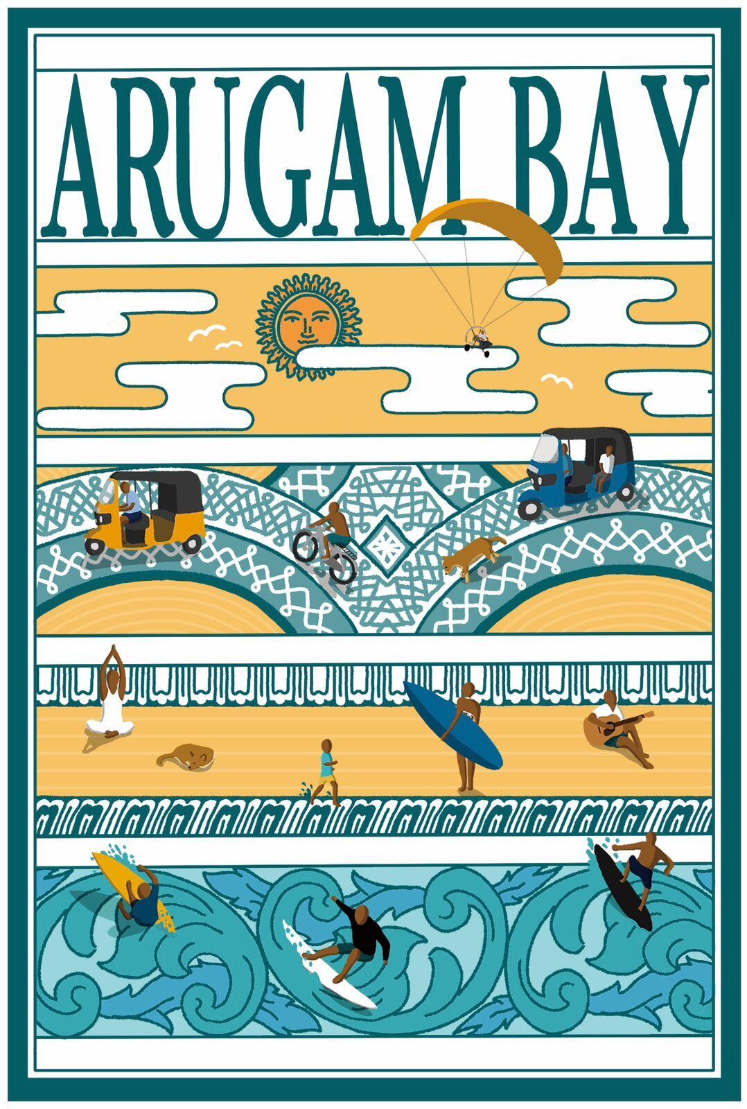 サーファーに人気の海辺の街・アルガンベイを、スリランカ伝統の文様で表現しました。 最下段は花をモチーフにした「Liya Patha」の模様。波のようにも見え、海の広がりを思わせます。その上は寺院の壁画にも描かれる「Pala Pethi」。続いて、1991〜2006年にかけて発行された50ルピー紙幣に使われた文様。そして最上段には、永遠や豊かさを象徴する太陽のシンボルを描きました。伝統と海の息吹を融合させたデザインです。